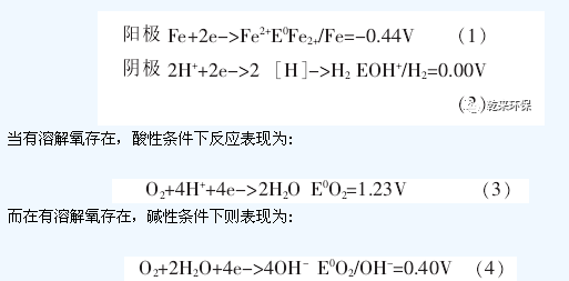 所用材料的鑄鐵屑和活性碳或焦碳,鑄鐵屑是鐵和碳的合金,其內部主要由純鐵和碳化鐵(Fe3C)組成,其中Fe3C以極為細小的微粒分散在鐵屑內。當將鑄鐵鐵屑浸沒在電解質溶液中時,由于Fe3C比純鐵更耐腐蝕,二者之間存在著明顯的氧化還原電勢差,這樣便在純鐵和碳化鐵之間形成了無數多個細微原電池,純鐵為陽極,Fe3C為陰極。另一方面鐵屑與活性碳形成較大的原電池,鑄鐵為陽極,碳為陰極,使鐵屑在受到微原電池腐蝕的基礎上,又受到較大原電池的腐蝕。在這些細微原電池中,陽極在電池反應中表現為失去電子被氧化,而陰極得到電子被還原,但反應比較復雜。在微電池中電極反應為: